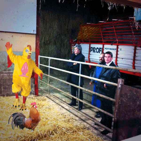 Pour notre part, nous garderons de ce déplacement l’impérissable souvenir des deux ministres subjugués dès potron-minet par le réveil de la basse-cour et le chant du coq qu’ils découvraient pour la première fois de leur vie. Le Président de la République en personne avait fait le déplacement dans la nuit pour les soutenir dans cette épreuve angoissante et avait revêtu son costume de coq pour chanter comme le gallinacé : « moi je, j’ai décidé, j’ordonne ! »