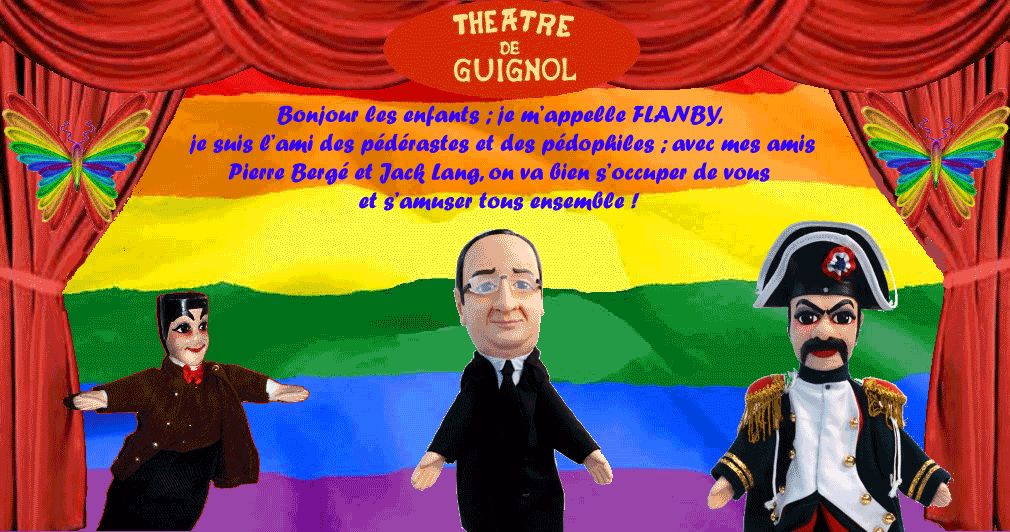 Pour l’arbre de NOEL de l’ELYSEE 2014, le locataire normal et proche des « sans dents » mouille sa chemise ; réservez dès à présent vos places pour la représentation exceptionnelle donnée en la présence des inconditionnels du régime et adhérents de la Ligue des Amis extraordinaires du Guignol de l’Elysée : Guignol et sa compagne Madelon, Gnafron, le Gendarme, Jack Lang, Jacques Attali le plagiaire, Manuel Valls, Bruno Leroux (Président du fan-club et lèche-botte d’honneur), Claude Bartolone, de ses porte-parole Pierre Bergé, Xavier Niel, Matthieu Pigasse, Edwy Plenel, ainsi que son harem, Anne Hidalgo, Ségolène Royal, Valérie Trierweiller, Julie Gayet, des Rapetou trotskystes qui ont colonisé la direction du Parti Socialiste : Jean-Christophe Cambadelis, Harlem Désir, Julien Dray, Jean-Marie Le Guen, et des clients habituels et serviles dont la présence sera tolérée par leur « patron » patricien : Yannick Noah, Audrey Pulvard, Roselyne Bachelot, Stéphane Guillon, Nicolas Bedos, Laurent Ruquier, Aymeric Caron, fidèles habitués des mangeoires élyséennes, ainsi que l’aristocratie pédérastique de l’Assemblée Nationale : Jean-Luc Romero, Sergio Coronado, Franck Riester, et de la mairie de Paris : Bruno Juilliard, 1er adjoint, Rémi Féraud, Ian Brossat, Christophe Girard ; les membres du « Cabinet noir antisarkozyste » de l’Elysée seront bien présents, en premier le meneuse de revue, Jean-Pierre Jouyet – secrétaire général de la République Française et manipulateur en chef -, mais leurs identités ne peuvent être révélées ici pour des raisons de « sécurité nationale ».