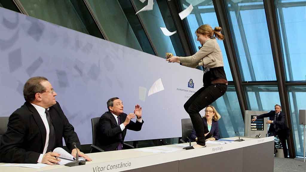 Et concurremment, l’autre troupe de comiques « agit-prop » manipulée, protégées du gouvernement, les FEMENS, agressait le Directeur de la BCE, Mario Draghi, alors qu’il prenait la parole à une tribune officielle. Mais reconnaissons à ces jeunes filles une parfaite condition physique : le saut de cette jeune femme sur la tribune est impressionnant, comme l’avait été celui de l’une de ses collègues sur l’autel de la Cathédrale de Cologne pendant la célébration de la messe de minuit.