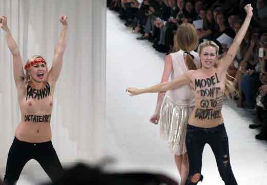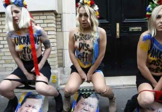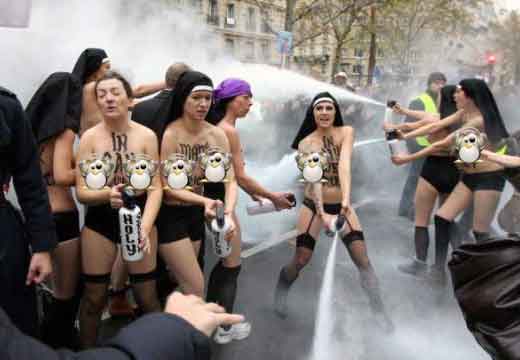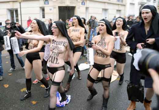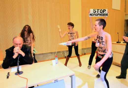 le communautarisme « gay » parisien, regroupé autour de Pierre Bergé, Anne Hidalgo, Najat Vallaud-Belkacem, Christiane Taubira, encouragés par Caroline Fourrest, Audrey Pulvard, Aymeric Caron, Laurent Ruquier, Nicolas Bedos et les députés Jean-Luc Romero, Sergio Coronado – fit exfiltrer vers Paris une des leaders du mouvement ukrainien des « Femens », poursuivie pénalement dans son pays pour avoir tronçonné et abattu un monument représentant une croix érigée en mémoire des millions de victimes des purges staliniennes, Inna Shevchenko. Elle obtint avec une scandaleuse rapidité le statut de réfugiée politique !, et dans le local fourni par la Mairie de Paris, put recruter dans les milieux de la prostitution afin de préparer des actions de provocation et d’agitation-propagande destinés à créer des incidents lors des défilés de LA MANIF POUR TOUS, déconsidérer dans l’opinion publique ce mouvement, tout en discréditant ses responsables (campagnes de dénigrement reprises dans la presse Bergé-Niel-Pigasse, selon les méthodes de manipulation de l’opinion héritées des périodes fascistes – nazies – et staliniennes, reprises dans notre pays par Manuel VALLS, le petit Caudillo d’Evry, à l’exemple de son modèle Clémenceau lors des grèves des viticulteurs languedociens en 1907).