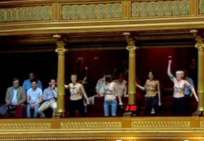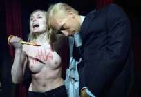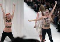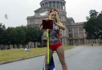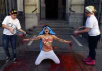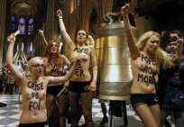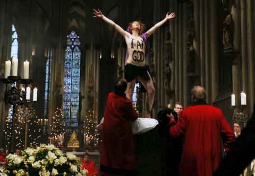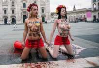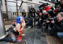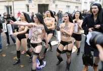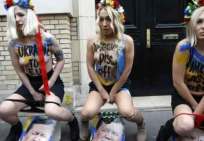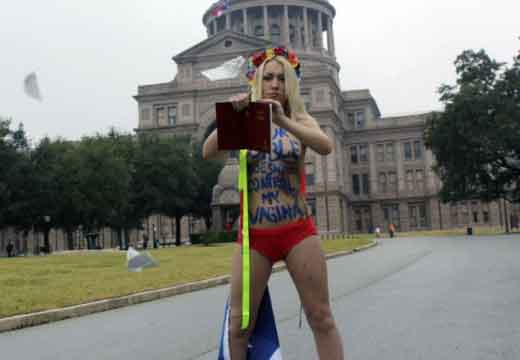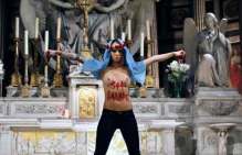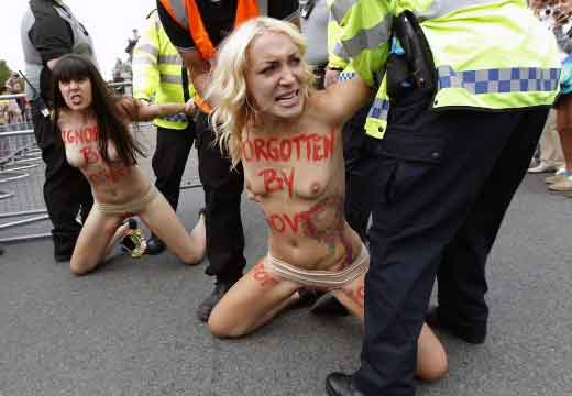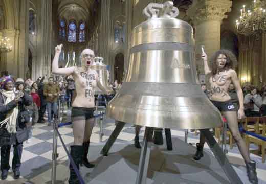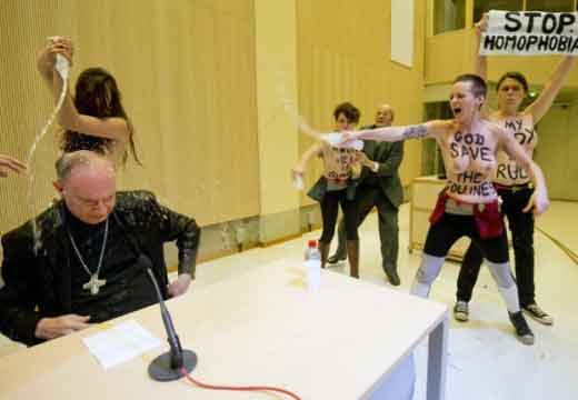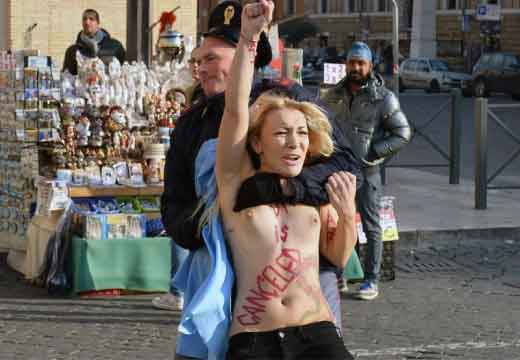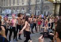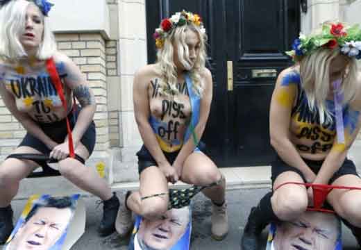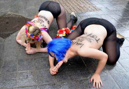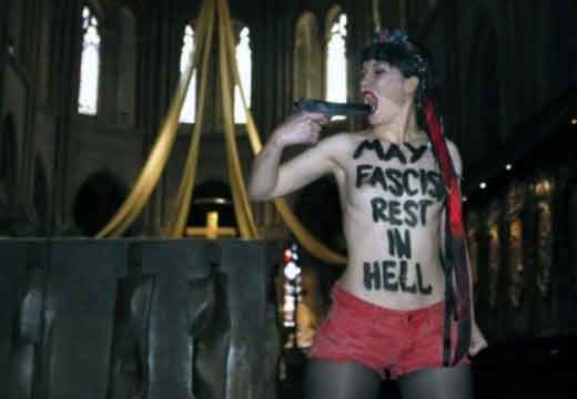 Icône Nationale du socialisme à la sauce « gay-friendly » parisienne, Inna poursuivit alors son combat catholiphobe, organisant lors de Noël 2013 des opérations de profanations et de dégradations d’édifices catholiques, pendant la célébration du culte dans les cathédrales de Paris et Francfort, au Vatican, à Madrid ; en France, les FEMENS purent même uriner sur l’autel où est célébrée la messe chrétienne, sans être inquiétées, puisque comme le dit le communautarisme « gay » parisien, le délit de « profanation » a été aboli. Leur pouvoir étant sans limite, on les retrouve devant le Parlement européen de Strasbourg mimant des actes de fellation et de sodomie devant les journalistes accrédités à leur cause, perturbant le départ à Londres du Tour de France 2014, décapitant une statue en cire de Poutine au musée Grevin, s’exhibant seins nus devant la cathédrale de Milan pour régler le conflit ukrainien, perturbant une séance du Sénat, puis manifestant dans la cour du Palais de Justice de Paris, avant d’interpeller le 28.10 leur ami et lord-protecteur Bozzo le Clown. Il s’agit bien entendu d’une mise en scène destinée à amuser le peuple des « sans dents » et les journalistes « accrédités » dans une période politiquement agitée et instable, alors que FLANBY devait prendre la parole suite au décès du jeune toulousain de 21 ans, Rémi FRAISSE, lors d’une manifestation contre le barrage de SIVENS ! Le mutin BOZZO est toujours favorable à une petite « blagounette », même à l’occasion de la mort inutile d’un jeune homme de 21 ans !. Alors, puisque le contexte s’y prêtait parfaitement et que ses affidés FEMENS étaient disponibles, autant en profiter !
