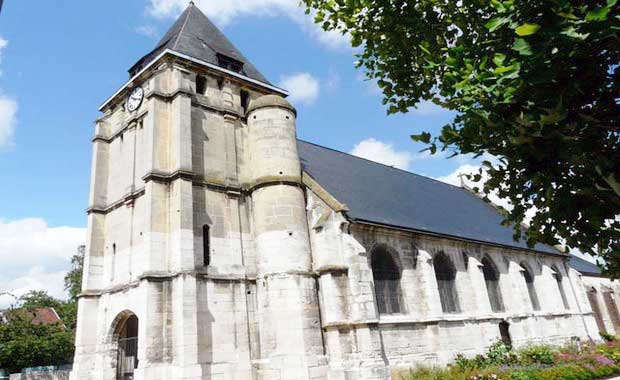 « Le soleil noir de la mélancolie » réchauffe ce soir le vautour féroce (Bozzo) et sa hyène soumise (Cazeneuve) qui, alléchés par l’odeur du sang et des médias, se sont abattus en fin de matinée sur la commune de Saint-Etienne-du-Rouvray, où le Maire communiste « Peppone » Hubert Wulfranc vient de perdre son vieil ennemi, le Père Jean Hamel, « Don Camillo », qui à 86 ans – alors qu’il était sorti provisoirement de sa retraite pour rendre service en célébrant la messe, a été égorgé au couteau devant l’autel, alors qu’un paroissien subissait le même traitement et se trouve entre la vie et la mort. Alors que l’attentat, revendiqué par DAESH, n’était même pas connu, le charognard Elyséen, se précipitait immédiatement sur place avec sa Hyène fidèle, ministre de l’intérieur, son coiffeur-teinturier et sa maquilleuse (puisque le but du déplacement est d’apparaître sur tous les médias, il faut bien être impeccable- qui bénéficient tous deux d’un contrat d’exclusivité de 9980 €/mois pendant cinq ans aux frais du contribuable -), les trois hélicoptères indispensables à ses déplacements d’homme normal et les 105 policiers assurant sa sécurité personnelle durant ses déplacements. « Peppone » eut droit à l’un de ces incroyables spectacles d’hommage, de compassion et d’émotion exhibitionniste lacrymale, lorsque BOZZO, les larmes aux yeux, vint l’enserrer dans ses bras pour lui faire part de son émotion et du caractère insupportable et indigne, puisqu’il avait une nouvelle fois décidé et ordonné que tout soit mis en oeuvre pour que les auteurs soient appréhendés et remis entre les gants de velours de la justice taubirienne, éventuellement poursuivis et condamnés ! Mais comme la BRI les avait impudemment abattus sans jugement lorsqu’ils s’étaient précipités sur les forces de l’ordre aux cris d’ALLAH AKBAR, cette nouvelle promesse sera difficile à tenir. Malheur à la B.R.I ! Honte à la B.R.I