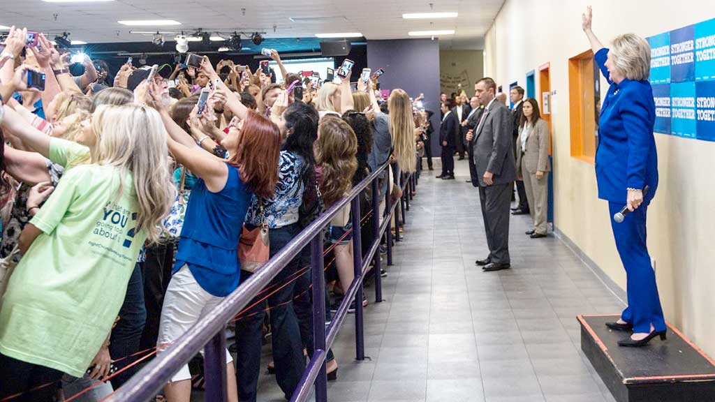 Cette photographie a été prise par la photographe officielle de la candidate, Barbara Kinney, et elle est utilisée comme argument de campagne tant elle est symptomatique de la génération « selfies », qui préfère tourner le dos à la candidate pour se prendre en photo en faisant une grimace plutôt que de la regarder et écouter ses propositions !