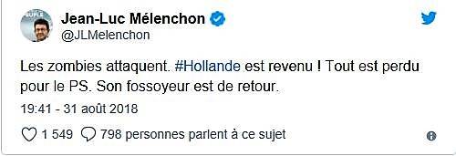Quand à MELENCHON, il ironisa dans un tweet : Les zombies attaquent. #Hollande est revenu ! Tout est perdu pour le PS. Son fossoyeur est de retour.